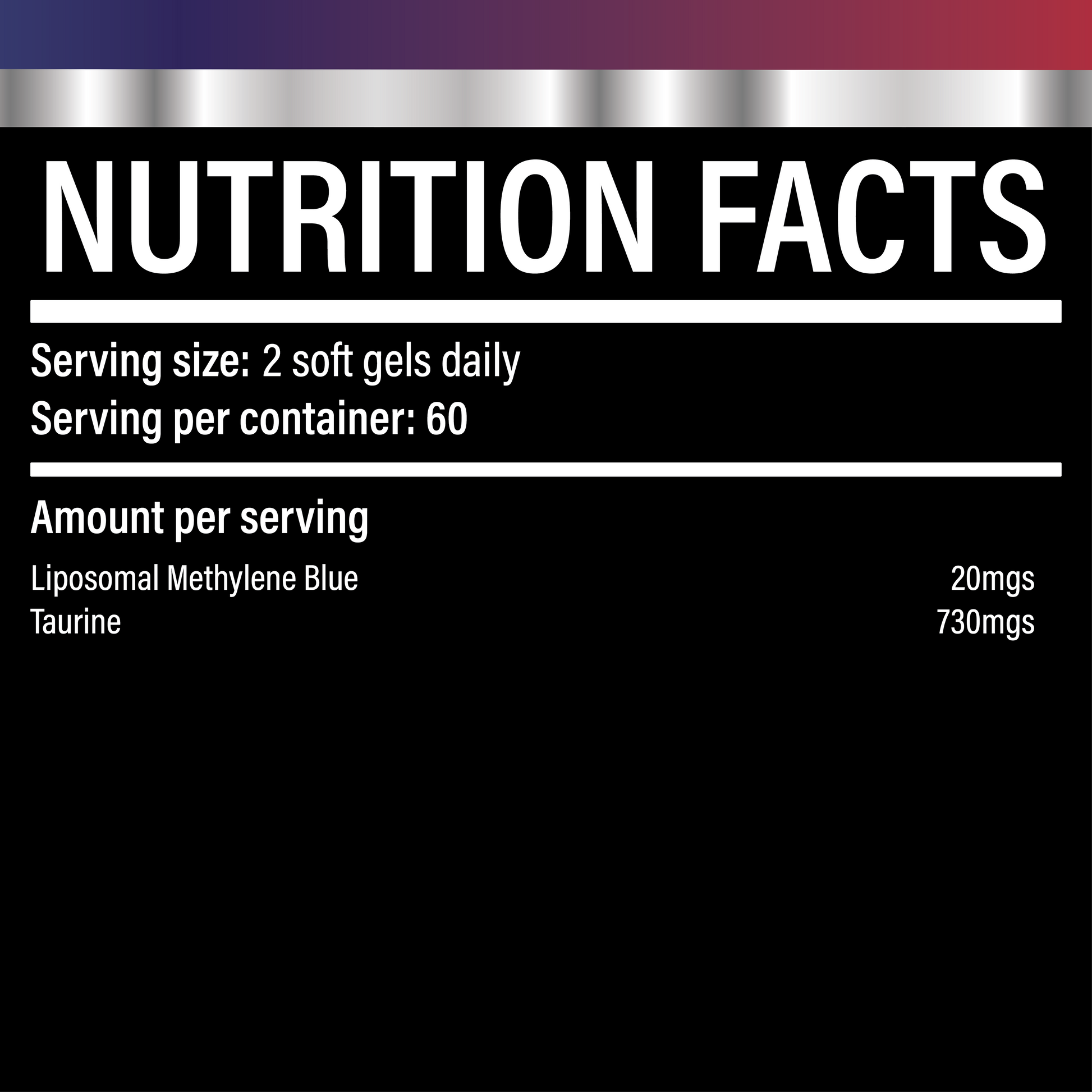 Methylene Blue and Taurine are combined in a liposomal delivery system for enhanced absorption.